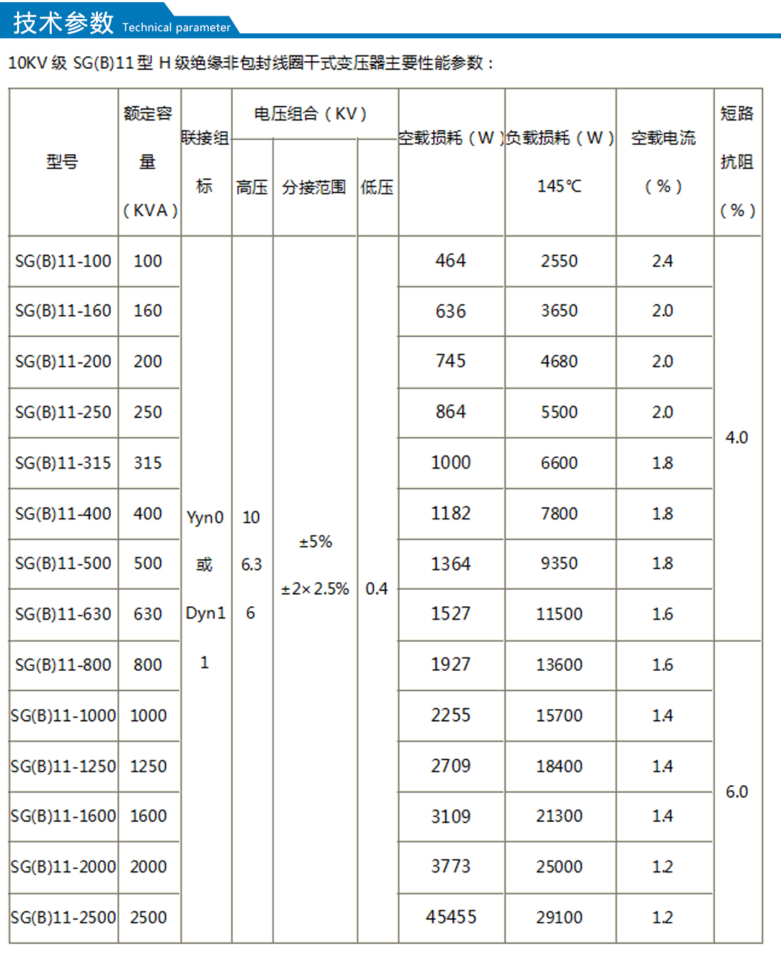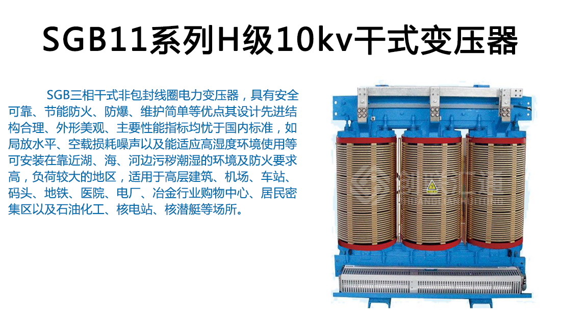 SG(B)11系列H級絕緣干式變壓器采用優質環保材料,先進的生產檢測設備按嚴格的工藝生產而成,具有高性能、高安全、承受熱沖擊能力強等特點,它適用于防火要求高、負荷波動大以及污穢潮濕的惡劣環境中。如:高層建筑、商業中心、住宅小區、醫院、化工廠、核電站、船舶及其它安全性要求防火、防爆、防潮的配電網絡與工礦企業供配電系統等重要或特殊環境場所。