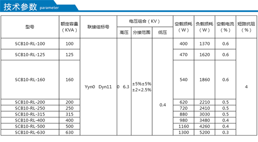 10KV級SCB10-RL-RL系列卷鐵心干式變壓器主要性能參數:
