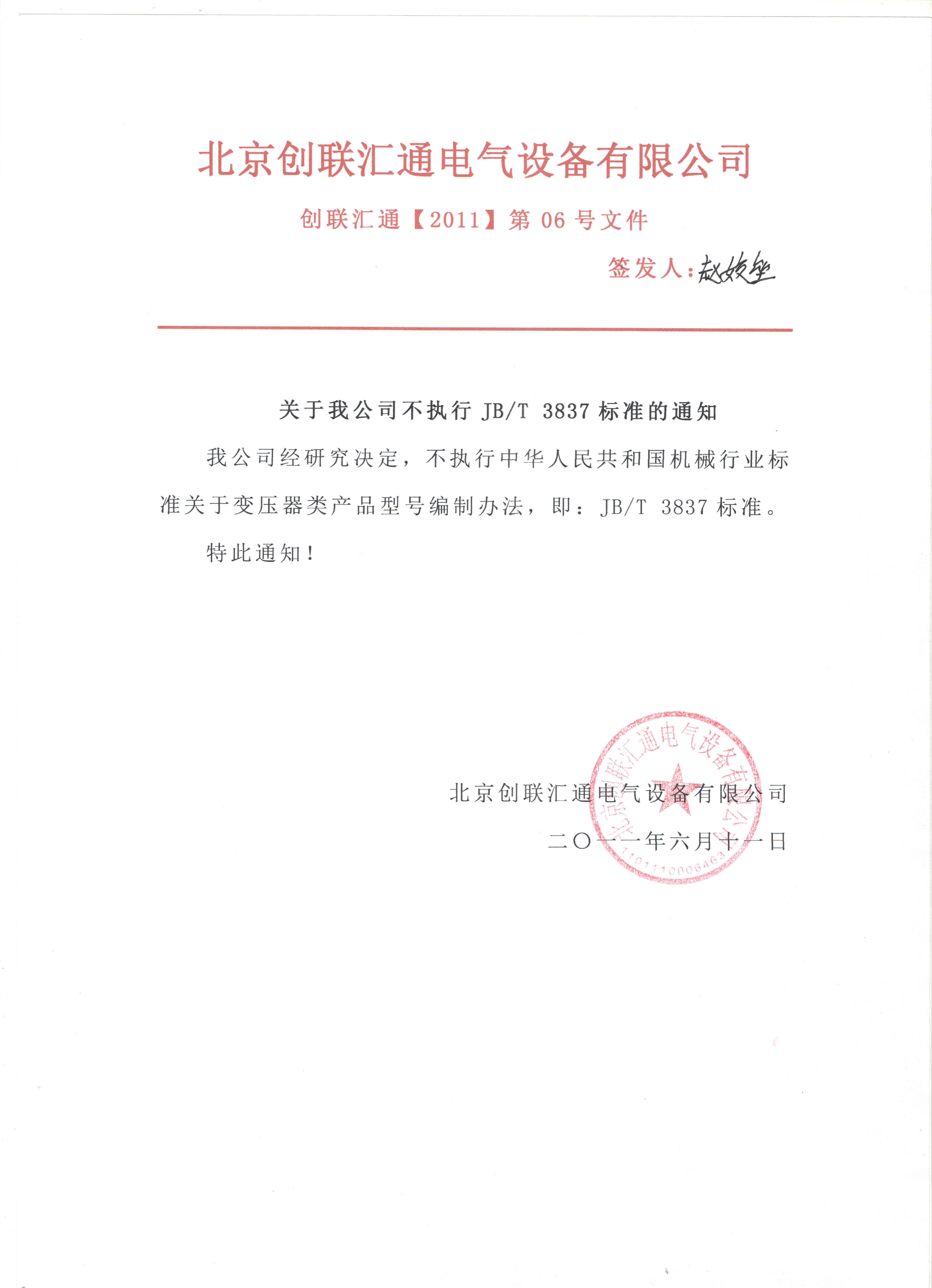 我公司經研究決定,不執行中華人民共和國機械行業標準關于變壓器類產品型號編制辦法,即:JB/T 3837標準。